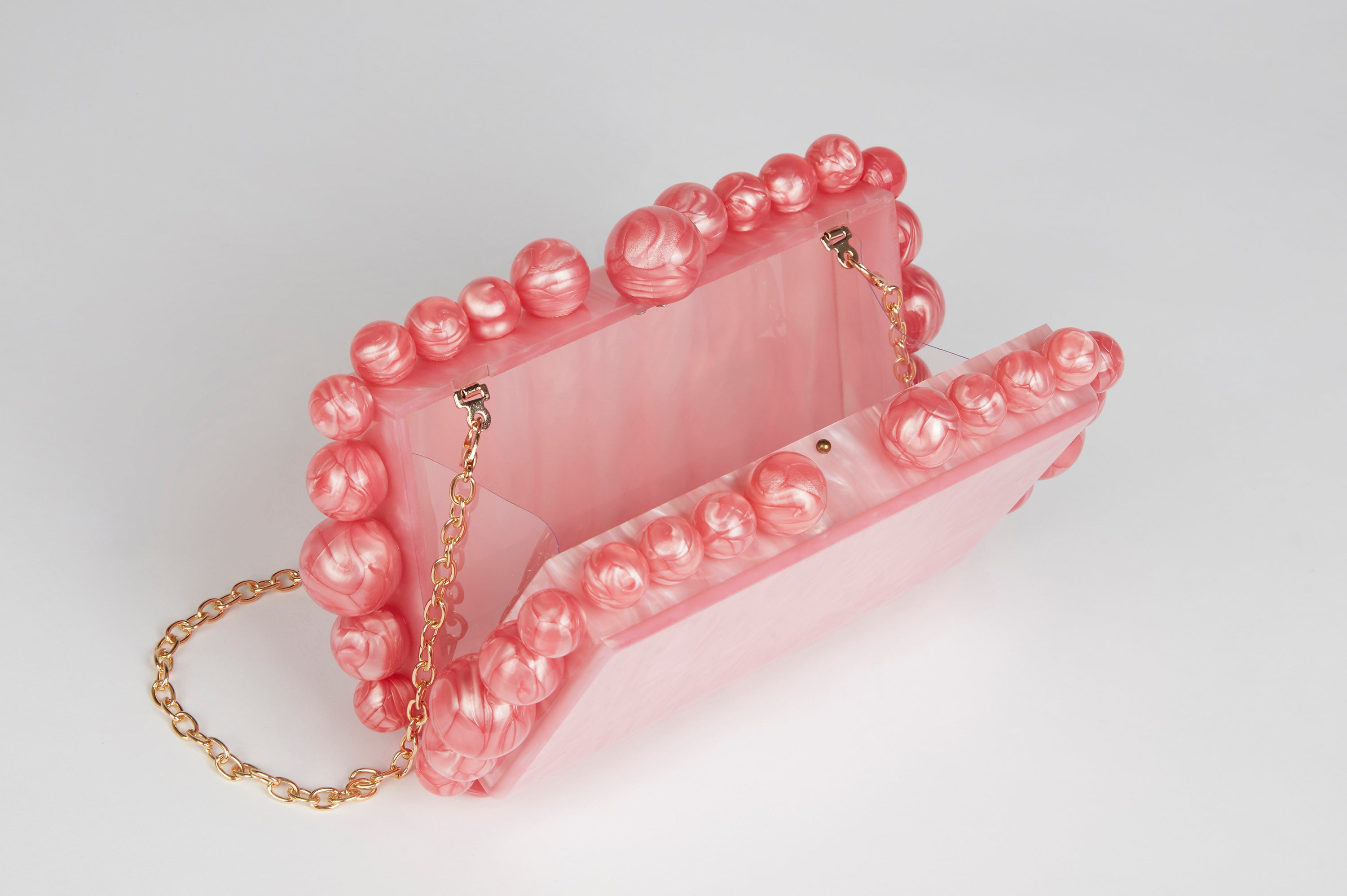 Fashion Acrylic Clutch Bag. Luxury Bridal Pink Pearlescent Acrylic Clutch Bag with Faux Pearl Trim