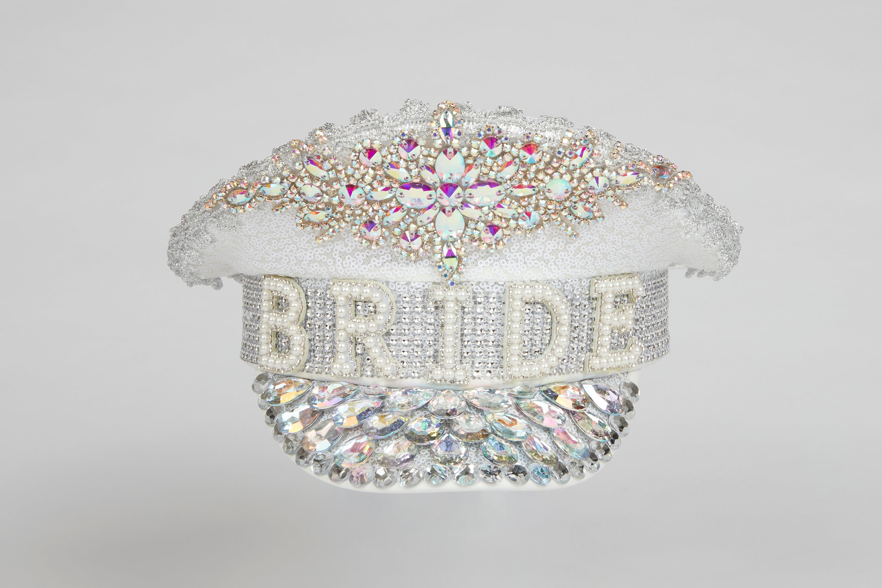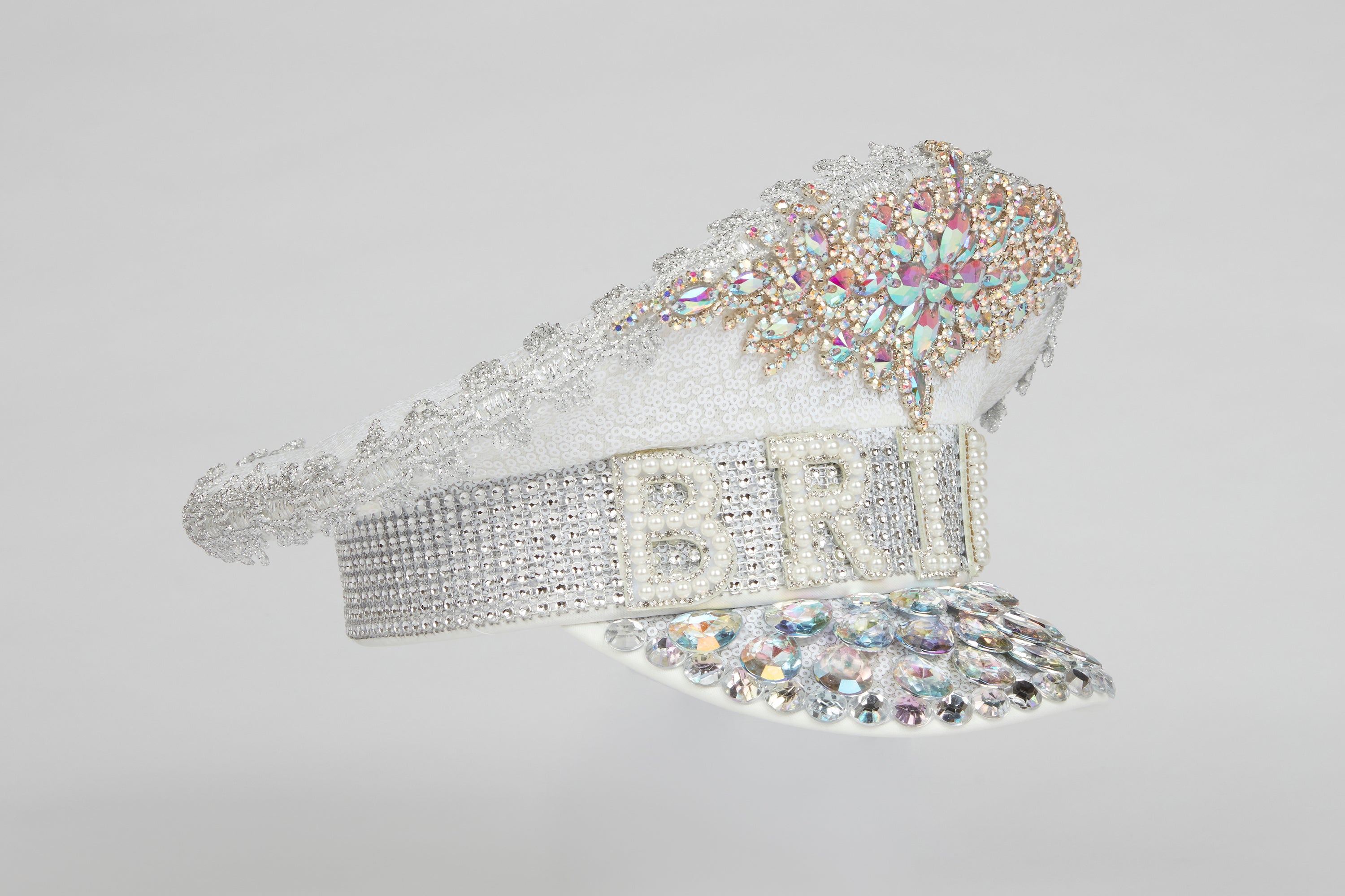 Bridal Luxury Faux Pearl Bride Hat. Elegant White Hen Do. Shiny Rhinestone Bachelor Party Captain Hat. The Sailor Hat is Perfect for Beach and pool Parties.