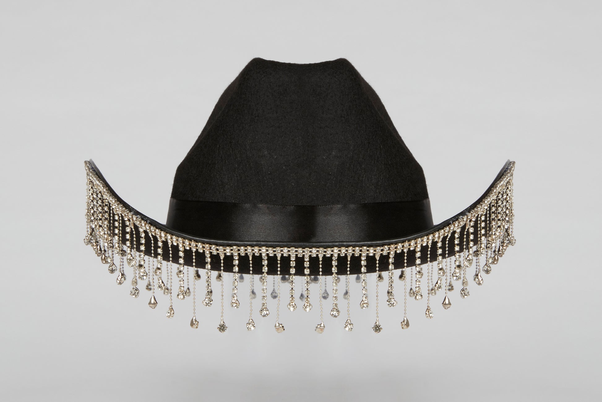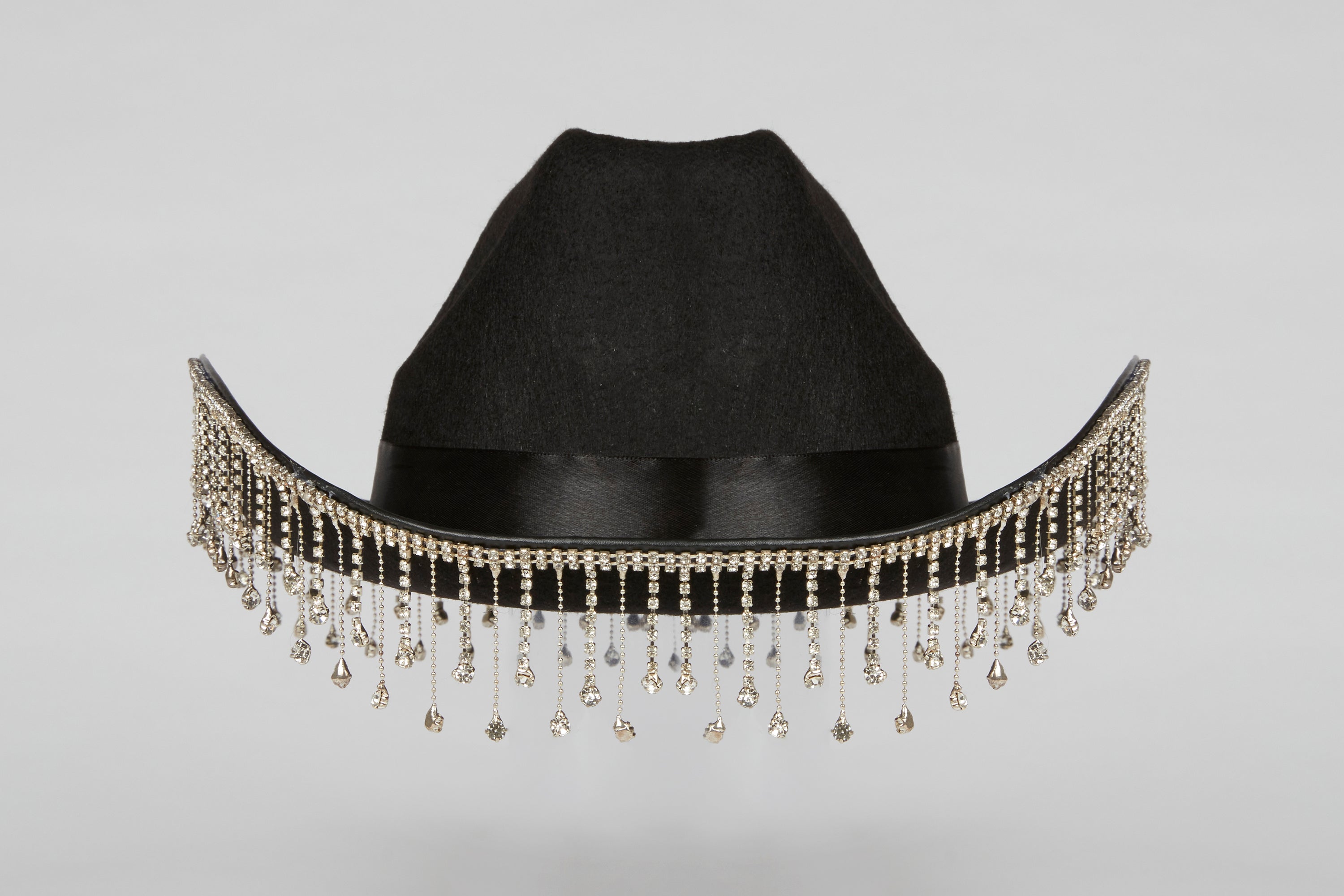 Black, classic and with a dropped diamante hem, this hat gives all the sass, so showcase your wild side and embrace your inner cowgirl - tonight, it's all about you!!!